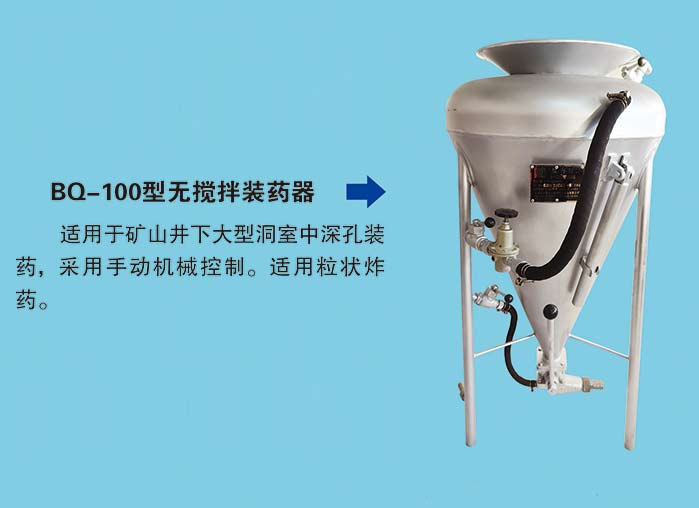 BQ-100型抬杠式無(wú)攪拌裝藥器,適用于礦山井下大型洞室中深孔裝藥,采用手動(dòng)機(jī)械控制。適用粒狀炸藥。