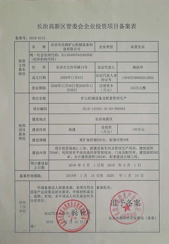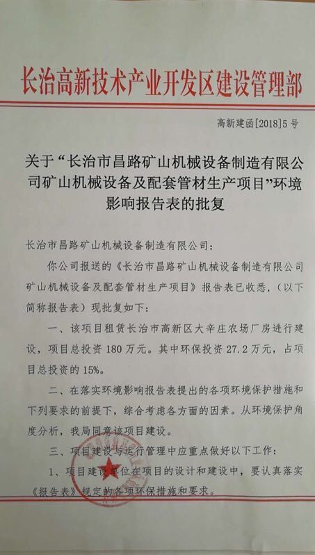 關(guān)于“長治市昌路礦山機(jī)械設(shè)備制造有限公司礦山機(jī)械設(shè)備及配套管材生產(chǎn)項(xiàng)目”環(huán)境影響報告表的批復(fù)